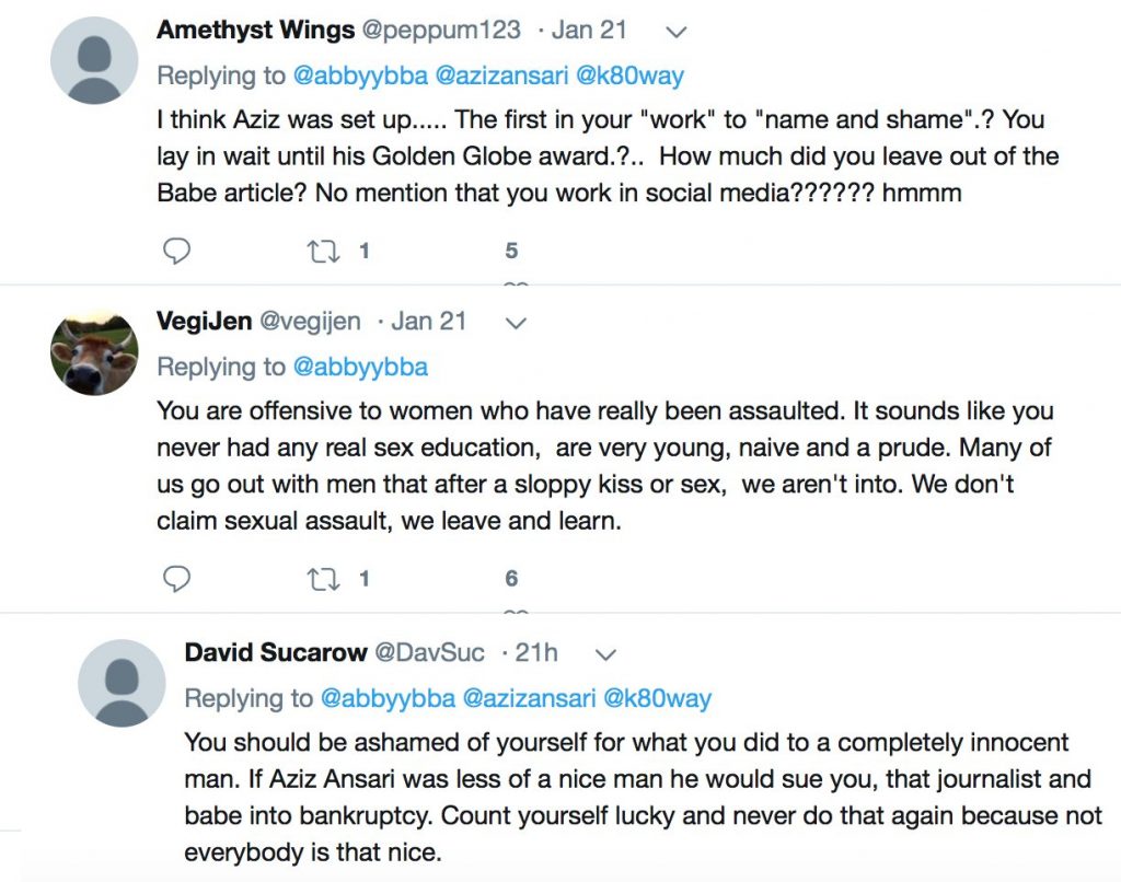twitter-on-abby-2 Published 11 February, 2018 at 1223 × 963 in Stating The Obvious 0511 – Abby Nierman and Aziz Ansari: What Was Really Going On. Discover more from Cynical Libertarian Society Subscribe to get the latest posts sent to your email. Type your email… Subscribe
