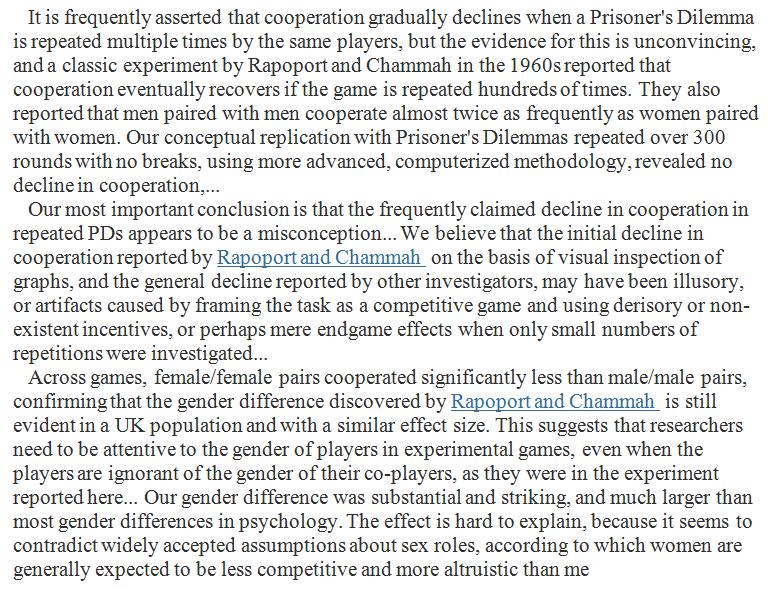 They also reported that men paired with men cooperate almost twice as frequently as women paired with women. Our conceptual replication with Prisoner’s Dilemmas repeated over 300 rounds with no breaks, using more advanced, computerized methodology, revealed no decline in cooperation, apart from endgame effects in the last few rounds, and replicated the substantial gender difference, confirming, in the UK, a puzzling finding first reported in the US in the 1960s.
